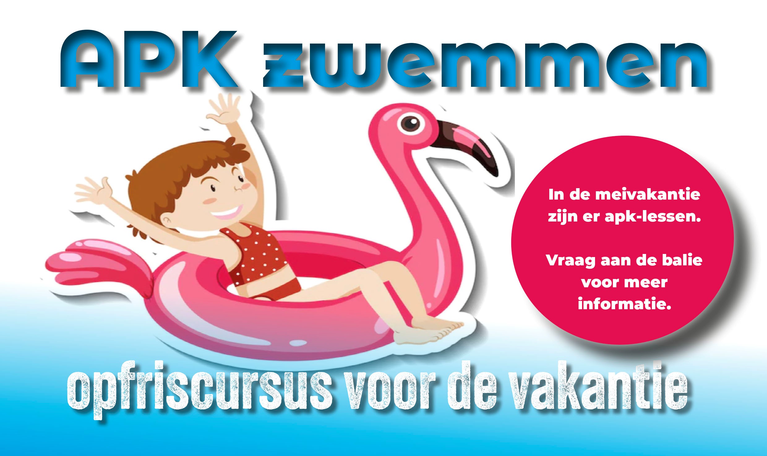 Tijdens de meivakantie is er weer de gelegendheid om de zwemvaardigheid van het zwem ABC op te frissen. Deze cursus wordt afgesoten  met een certificaat. Voor meer informatie en inschrijven, kom even langs bij de balie.